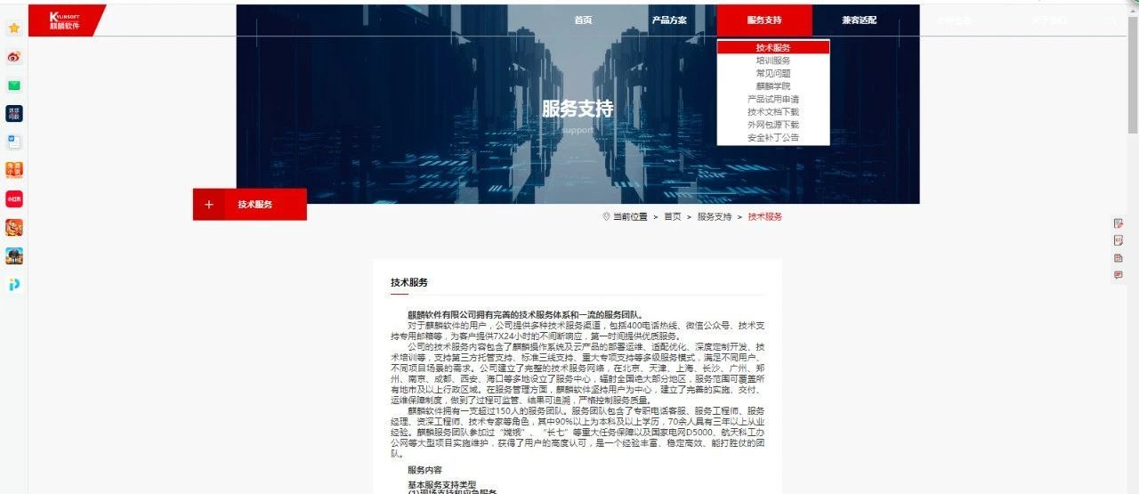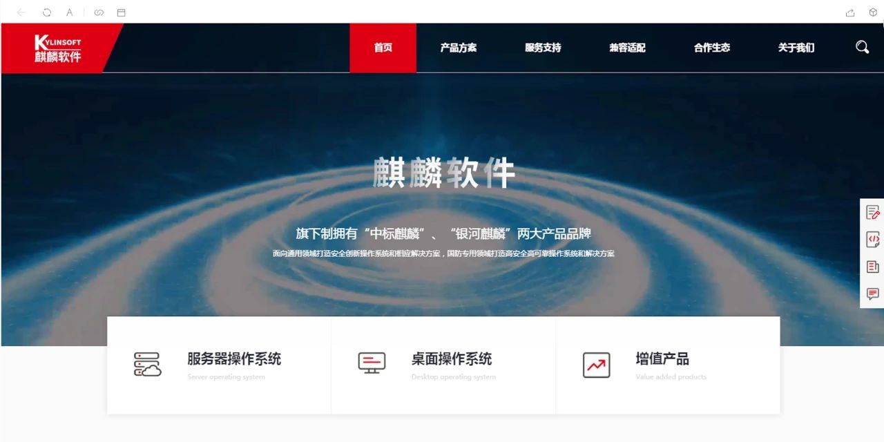 开启网站首页,格局清晰的类目及麒麟软件的主流产品信息即可一目了然。六大类目:“首页”、“产品方案”、“服务支持”、“兼容适配”、“生态合作”、“关于我们”等位列首页顶端。麒麟软件硬核介绍C位当中,迅速让您了解公司概况。两类明星产品 ——“服务器”、“桌面”操作系统混搭附加“增值产品”支柱当家,正立首页下方。
