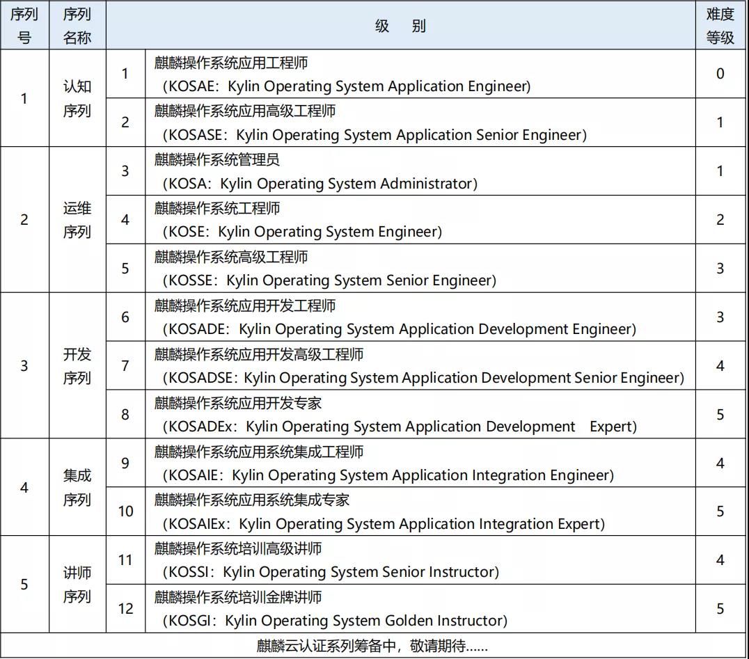 为全面贯彻落实党的十九大和十九届二中、三中、四中全会精神,立足制造强国、网络强国和人才强国战略全局,推进国产信息化产业发展和人才、技术生态建设,同时普及广大用户对于麒麟操作系统的了解,满足各合作伙伴及IT从业人员对麒麟操作系统的熟练使用、高效运维乃至开发技能等的需求。麒麟软件有限公司专家团队经过充分的需求调研、科学的模型搭建及多次全面的内部研讨,制定了5序十二级培训认证体系,服务于国产信息化产业及相关人员。麒麟操作系统认证培训体系承载机构为麒麟软件创建的麒麟学院。