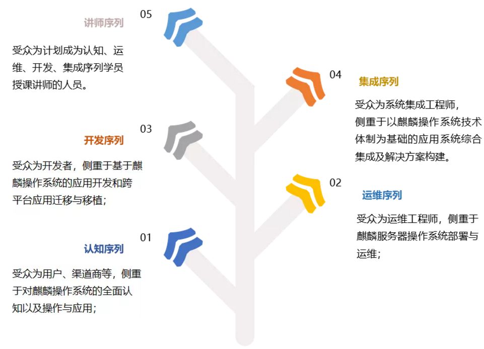 麒麟软件5序十二级培训认证体系课程均源自麒麟软件核心技术,具体包含操作系统的使用以及维护、应用程序的开发移植、HPC、云计算、信息安全等。其中“5序”指面向“认知、运维、开发、集成、讲师”5个序列人员进行认证培训课程的设置,根据人员角色匹配不同的知识元素,使各类人才都能找到并科学选择适合自己的学习板块。