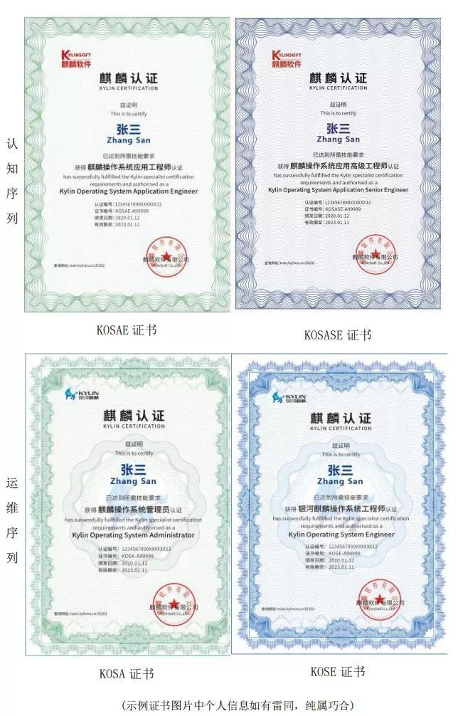 为了更好地检测学员的学习效果,同时为认证提供依据,每门课程结束后,都要进行相应的考试检测。考试通过后,麒麟软件为学员发放相应级别的认证证书。认证证书不仅是对于培训学习成果的检测,同时也是个人专业能力的体现,有利于提升个人职场综合竞争力。对于企业用户而言,也是竞标项目中有力的证明材料。麒麟认证证书包含多重要素,其中认证编号是根据学员个人身份证号码生成,一人一号,终生有效;证书编号是根据学员获得该级别认证证书的次序编号,越早获得,号码越小,同批学员,考核分数越高,排位越靠前;证书一般有效期为三年。同时,证书可在麒麟学院官网(http://inst.kylinos.cn:35202)进行“证书查询”核验真伪,保证了证书的真实有效。