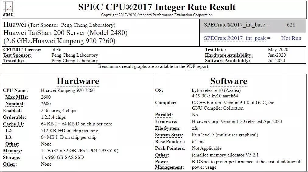 2020年6月30日,国际权威的标准性能评测组织SPEC(Standard Performance Evaluation Corporation)在其官网发布了由鹏城实验室作为SPEC会员提交的全球首个基于麒麟操作系统的ARM架构SPEC CPU2017测试报告。