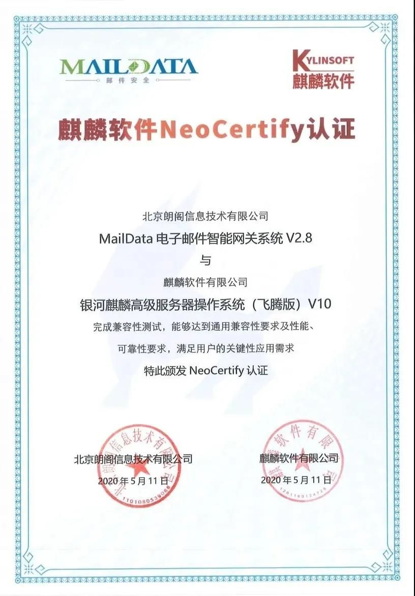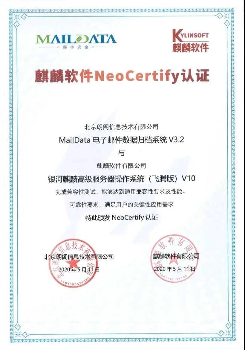 近日,麒麟软件有限公司与北京朗阁信息技术有限公司完成兼容性测试。此次兼容互认证的产品有MailData电子邮件数据归档系统V3.2、MailData电子邮件智能网关系统V2.8与银河麒麟高级服务器操作系统。测试结果表明,双方产品能够达到通用兼容性要求,运行稳定,各项功能工作正常。