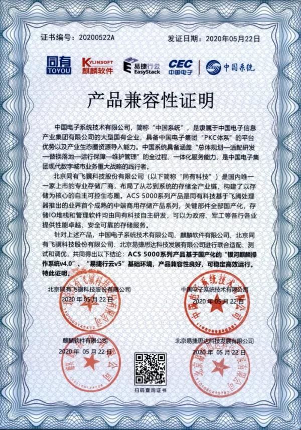 近日,麒麟软件与同有科技、中国系统、易捷行云EasyStack进行联合适配、测试和调优,共同得出以下结论:同有科技的ACS5000系列产品基于国产化的“银河麒麟操作系统V4.0”、“易捷行云V5”基础环境,产品兼容性良好,可稳定高效运行,满足用户关键性应用需要。