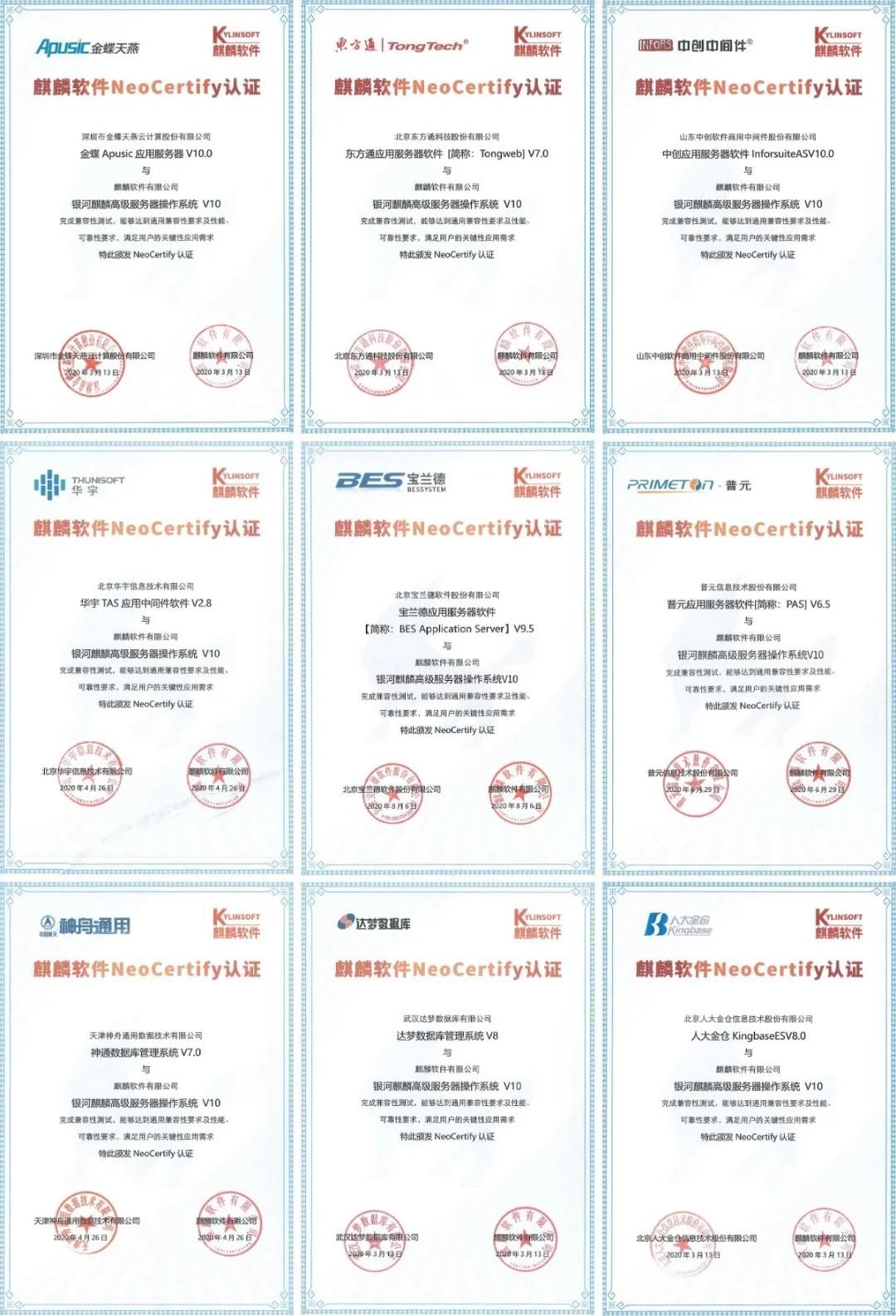 具体包括:金蝶Apusic应用服务器V10.0、东方通应用服务器软件V7.0、中创应用服务器软件InforSuite AS V10.0、华宇TAS应用中间件软件V2.8、宝兰德应用服务器软件V9.5和普元应用服务器软件V6.5等多款基础通用中间件以及神通数据库管理系统V7.0、达梦数据库管理系统V8、人大金仓Kingbass ES V8.0等。