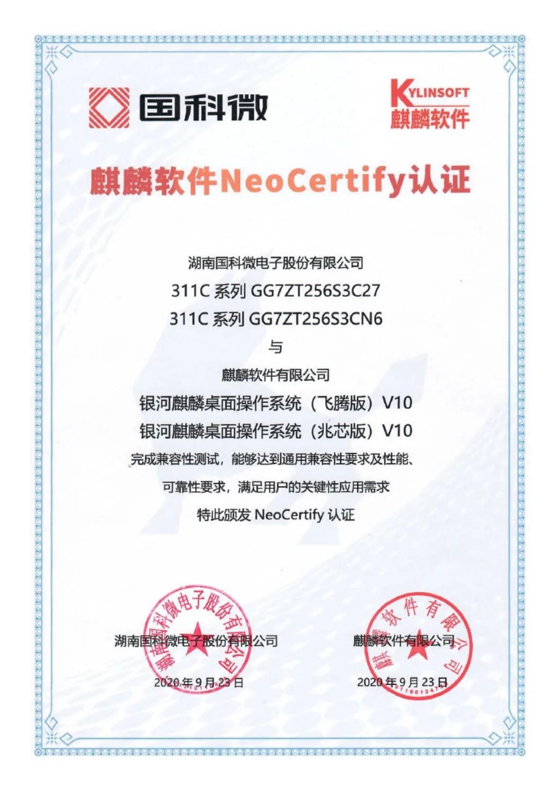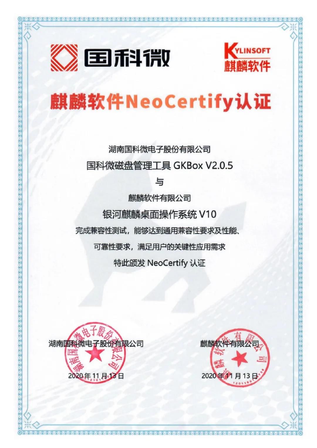 近日,麒麟软件与国科微完成产品兼容性互认证。双方在经过安装测试、登录测试、硬件识别测试以及性能测试等一系列联合测试后得出,国科微固态硬盘产品311C系列、I10C系列、磁盘管理工具GKBox与银河麒麟操作系统均实现良好兼容,达到性能、可靠性要求,满足用户的关键性应用需要。