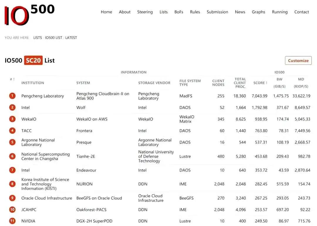 在大规模算力系统设计中,存储系统的性能日益受到关注。IO500是高性能计算领域针对存储性能最权威的世界排行榜之一。自提出以来已经得到了包括大学、国家实验室在内的研究机构和商业公司的广泛认可。自2017年11月开始,IO500榜单在高性能计算领域的顶级会议(美国的SC和德国的ISC大会)上发布。
