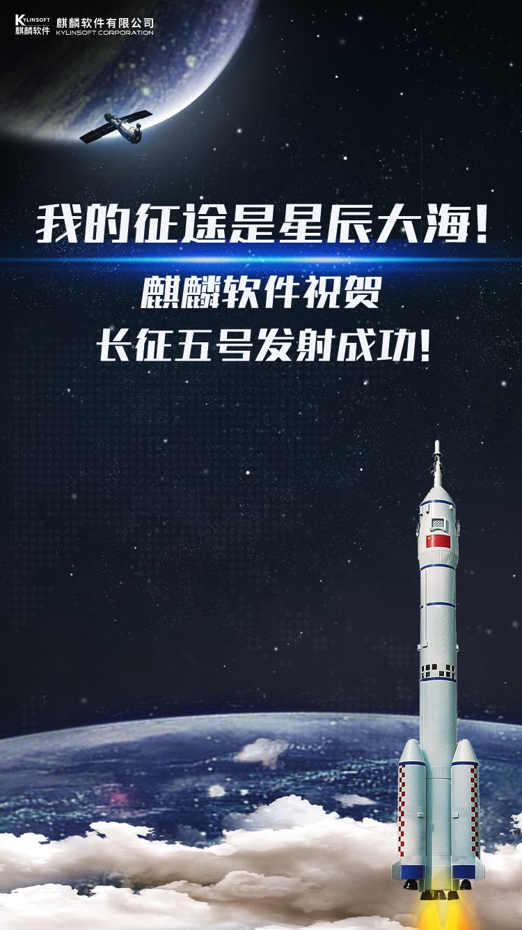 我的征途是星辰大海!——祝贺长五发射成功! 发布时间:2020-11-24 浏览次数: 11月24日4时30分,中国文昌航天发射场用长征五号遥五运载火箭,成功发射探月工程嫦娥五号探测器!火箭飞行约2200秒后,顺利将重达8.2吨的嫦娥五号月球探测器,送入近地点约200公里、远地点约40万公里的地月转移轨道。嫦娥五号将经过11个阶段、23天的在轨飞行,从月球取回2千克的土壤样本。当最胖的“长征五号”将最重的“嫦娥五号”送入月轨,标志着我国首次地外天体采样返回之旅正式开启!同样值得称道的是,银河麒麟操作系统,凭借安全可信的性能保障了长五航天任务的顺利执行!中国探索太空的征途上,以银河麒麟为代表的国产软硬件,始终为中国航天之路保驾护航!