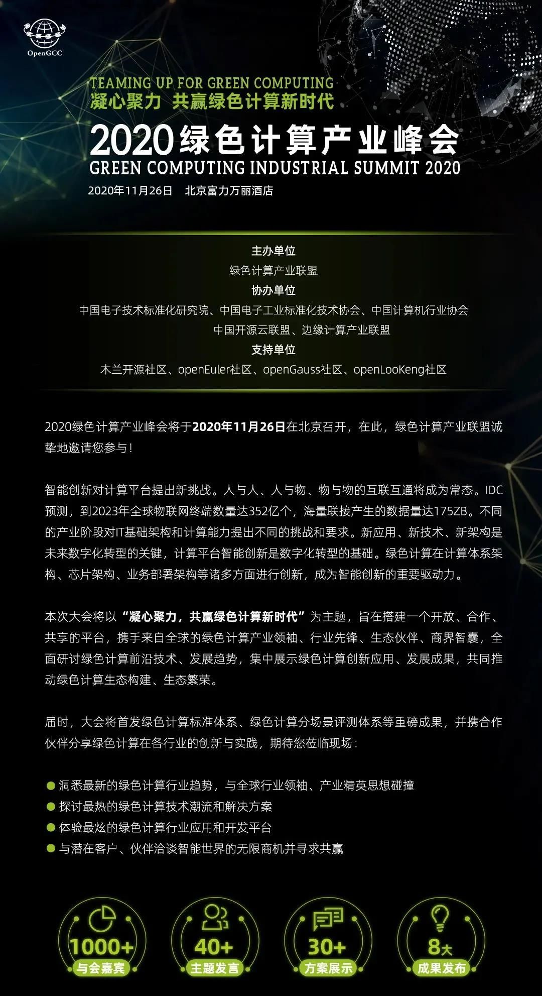 由绿色计算产业联盟(GCC)主办的2020绿色计算产业峰会(GCIS 2020)将于2020年11月26日在北京召开,本次大会以“凝心聚力,共赢绿色计算新时代”为主题,旨在搭建一个开放、合作、共享的平台,携手来自全球的绿色计算产业领袖、行业先锋、生态伙伴、商界智囊,全面研讨绿色计算前沿技术、发展趋势,集中展示绿色计算创新应用、发展成果,共同推动绿色计算生态构建、生态繁荣。