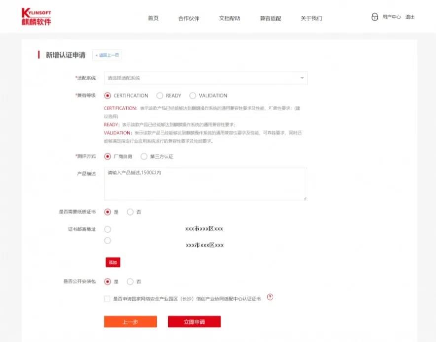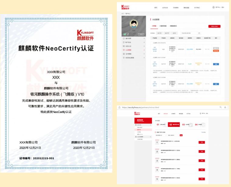 对合作伙伴而言,通过认证申请后即可通过网站平台提交认证申请、下载麒麟操作系统最新版试用镜像、跟踪认证进度、下载测试报告、获得认证帮助等;对于内部生态、测试管理员而言,也可通过网站平台对适配产品信息进行流程管理和信息交互。