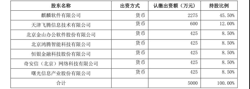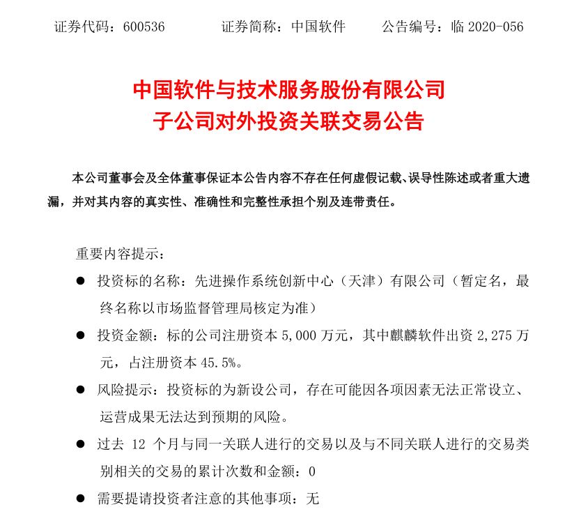 中国软件公告:麒麟软件拟联合出资成立先进操作系统创新中心(天津)有限公司