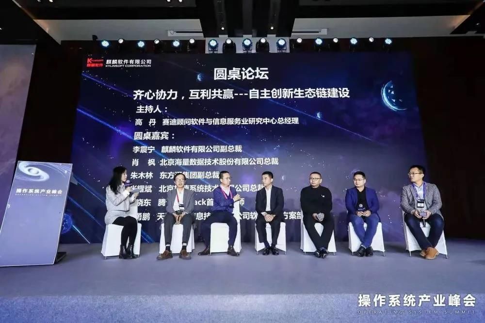 在“齐心协力,互利共赢——自主创新生态链建设”的圆桌论坛环节,赛迪顾问软件与信息服务业研究中心总经理高丹、麒麟软件有限公司副总裁李震宁、北京海量数据技术股份有限公司总裁肖枫、东方通集团副总裁朱木林、北京技德系统技术有限公司总裁张耀斌、腾讯云TStack首席架构师潘晓东、天津飞腾信息技术有限公司软件技术方案部总监刘勇鹏展开了精彩对话。