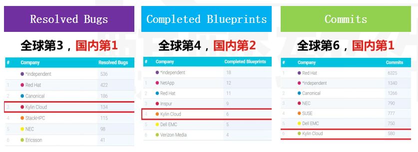 OpenStack社区成立于2010年,银河麒麟云团队自2013年起就积极参与OpenStack社区贡献,源于社区回馈社区,在最新的OpenStack Victoria版本中已累积合并patch 5000+,修复bugs 1600+,完成蓝图数40+,提交代码数十万行,贡献综合排名国内第一,全球前五。目前已有1个OpenStack官方项目PTL(Project Team Leader)和3个官方项目的Core,充分体现了银河麒麟云团队的技术实力。