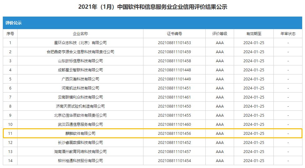 近日,麒麟软件荣获中国软件和信息服务业企业“AAA级信用等级”认证。该认证由中国软件行业协会组织,并在2021年1月最新的中国软件和信息服务业企业信用评价结果中进行公示。