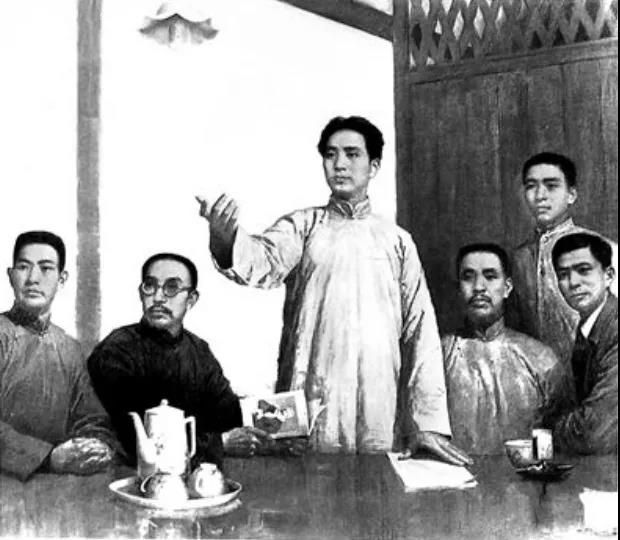 △油画《在党的第一次代表大会上》,画面正中为毛泽东,他的左边依次是董必武、邓恩铭、陈潭秋,右边依次是何叔衡、王尽美。