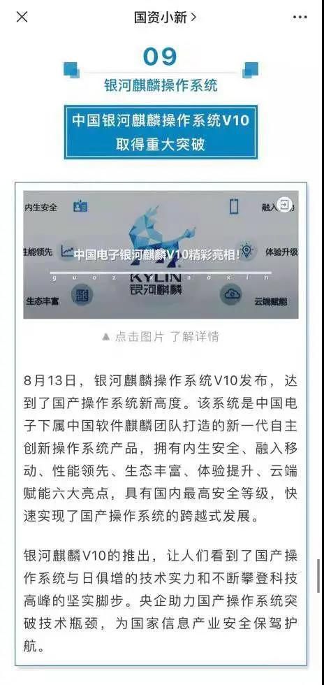 银河麒麟操作系统V10具有内生安全、融入移动、性能领先、生态丰富、体验提升、云端赋能的六大特性,达到了国产操作系统新高度,在综合性能、内存带宽、图形显示等方面高于同类产品17%到397%。在2020年,银河麒麟在SPEC CLOUD和IO500两次测试中,勇夺全球性能第一,展现了中国操作系统技术的先进水平。