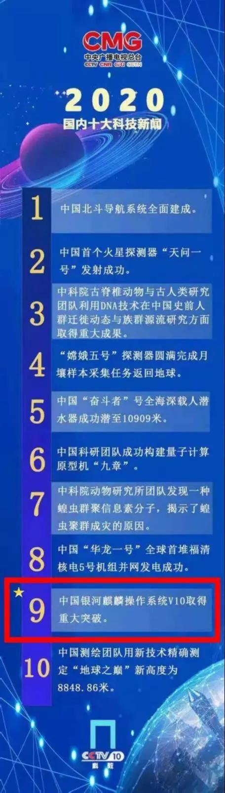 2020年底,由麒麟软件打造的新一代自主创新操作系统产品“银河麒麟操作系统V10”入选由中央电视台、中央人民广播电台、中国国际广播电台、中国国际电视台联合评选的“2020十大国内科技新闻”榜单,与其他国家科技领域重大成果一起名列其中;同时荣获国资委评选的“2020年度央企十大国之重器”。2021年2月23日, 银河麒麟作为国产操作系统代表入选“2020年度信创领域十大事件盘点”的研究报告,报告中多次提到了麒麟软件作为中国操作系统中坚力量在信创方面做出的突出贡献。