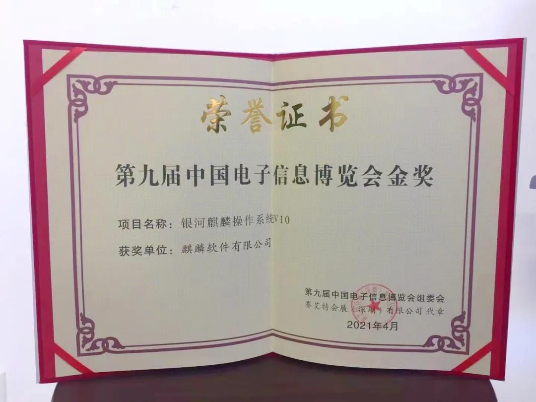 中国电子信息博览会作为中国电子信息产业新产品、新技术发展的风向标,博览会主办方组织了中国电子信息博览会金奖及创新奖评审活动。评审分为新型显示、集成电路、基础电子、智能网联与新能源、智能制造、智能硬件、信息技术创新应用七大类。近百家参展企业申报了上千项创新产品和应用,经过 20 名院士评委和行业专家的严格评审,共评选出 10 项中国电子信息博览会金奖。“银河麒麟操作系统V10”从上千个申报产品中脱颖而出,本次获奖,既是专家评审和行业对麒麟软件产品的充分认可,也是对麒麟软件技术创新和综合实力的肯定。