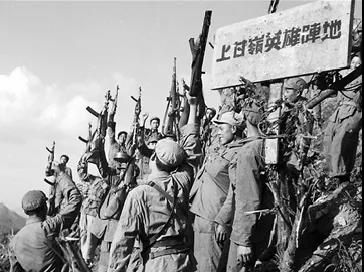 △1953年7月,守卫上甘岭的志愿军将士听到停战消息后为胜利而欢呼。
