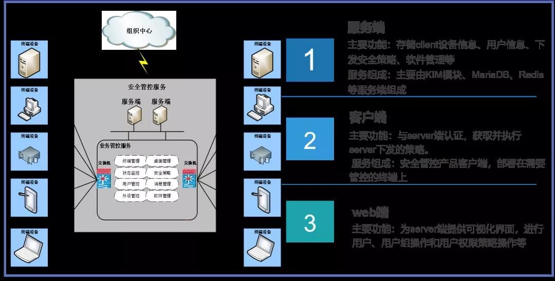 安全管控平台涵盖终端监控和终端管控两大功能,主要包含九个模块:组织管理、用户管理、终端管理、设备监控、安全策略、软件管理、消息管理、激活管理、配置中心。每个模块都可以基于政务、企业用户的不同需求,灵活配置功能点,帮助用户更安全高效地管理终端设备。