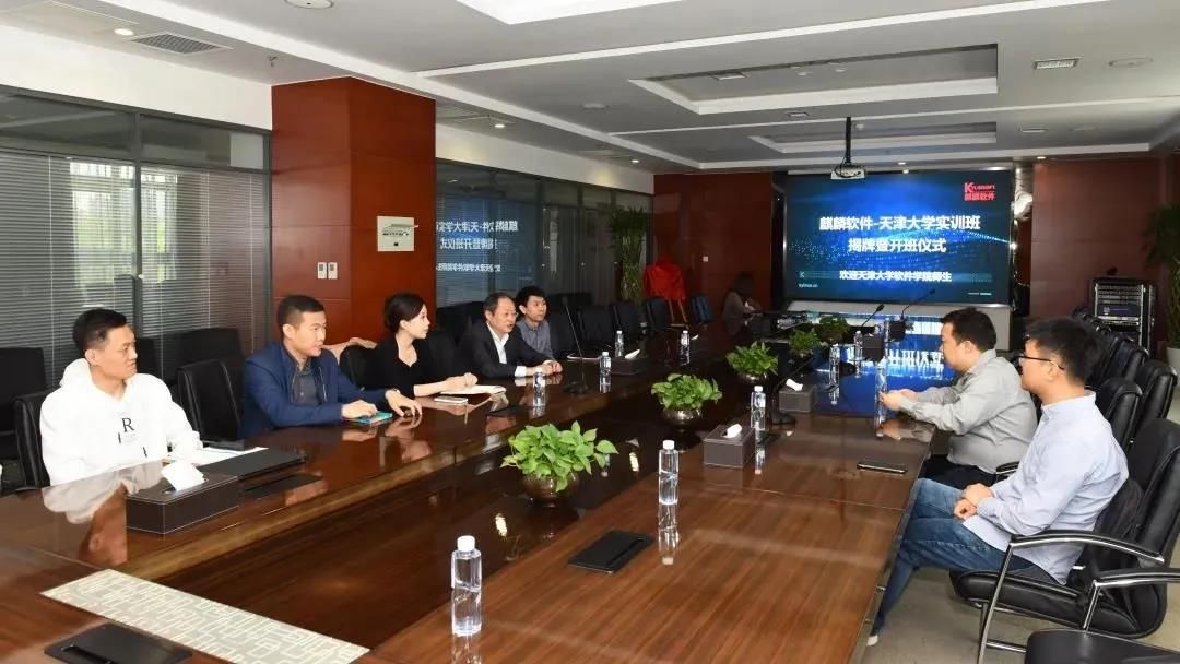 5月6日上午,麒麟软件-天津大学智能与计算学部实习实训基地揭牌暨开班仪式在天津总部举行。天津大学智能与计算学部副主任陶文源、软件学院副院长章亦葵、副教授陈俊洁、实训教师杜萱,麒麟软件高级副总裁周瑞平等相关领导以及天津大学20余位学生出席活动。