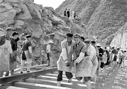 △1955年,宝成铁路工人在紧张地铺轨。
