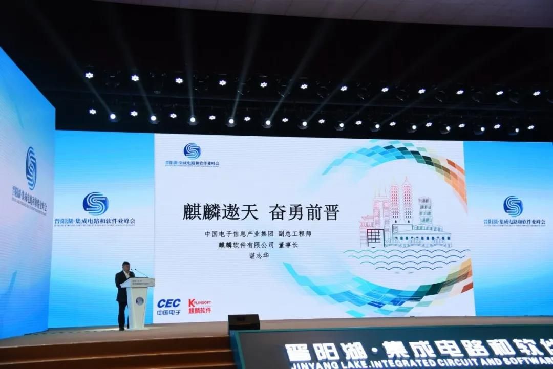 中国电子副总工程师、麒麟软件董事长谌志华出席了开幕式,并在“把握新阶段、融入新格局、谋划新布局、塑造新优势”的主旨论坛上,带来了主题为“麒麟遨天 奋勇前晋”的发言。