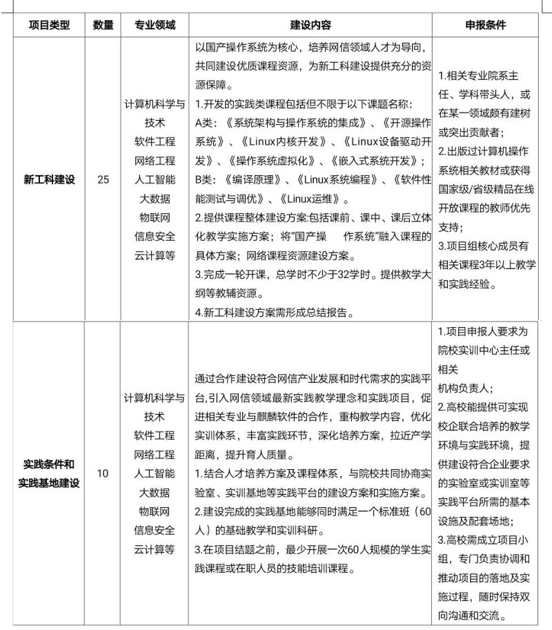 麒麟软件现面向全国高校公开发布2021年第一批项目申报指南,重点面向计算机科学与技术、软件工程、人工智能、大数据、网络工程等专业方向,征集新工科建设项目和实践条件和实践基地建设项目两类子项目,助力高校人才培养和专业综合改革,校企协同共同探索新一代复合型、创新型网信产业人才的培养模式。