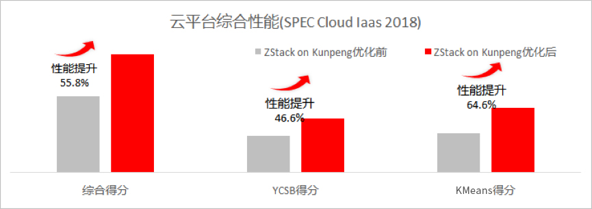 在IaaS私有云大数据及综合运算场景下, ZStack基于鲲鹏+银河麒麟服务器操作系统V10,应用使能套件BoostKit的虚拟化加速技术开展全栈优化,云平台综合性能提升55.8%,YCSB(社交媒体数据库应用场景)性能提高46.6%,KMeans(Hadoop大数据运算)性能提升64.6%。
