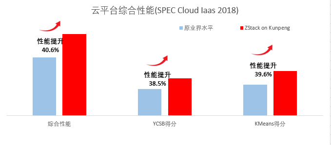 此次测试基于鲲鹏硬件,以银河麒麟服务器操作系统V10为底座,结合ZStack Cloud云平台损耗低、性能高的特点,所取得的SPEC Cloud结果不仅相较同类云厂商在鲲鹏服务器上性能提高40%~382%,对比同类云厂商在同规模的X86服务器上性能提高56%。