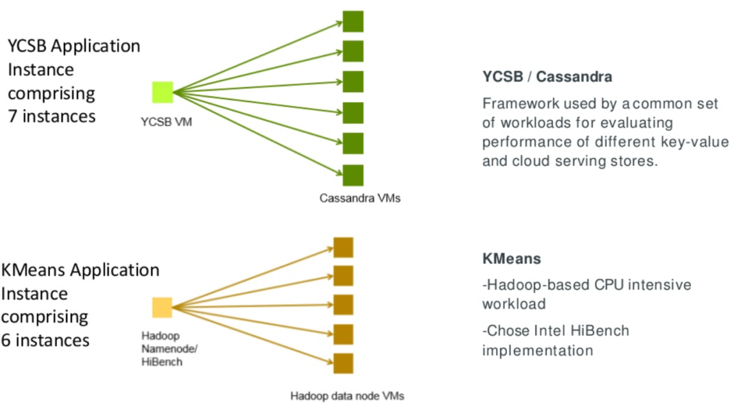 IO密集型负载测试 – YCSB:构建Cassandra实例模拟标准社交媒体NoSQL数据库应用场景,其测试项包括吞吐量、数据库插入、读取响应时间、应用实例配置时间。