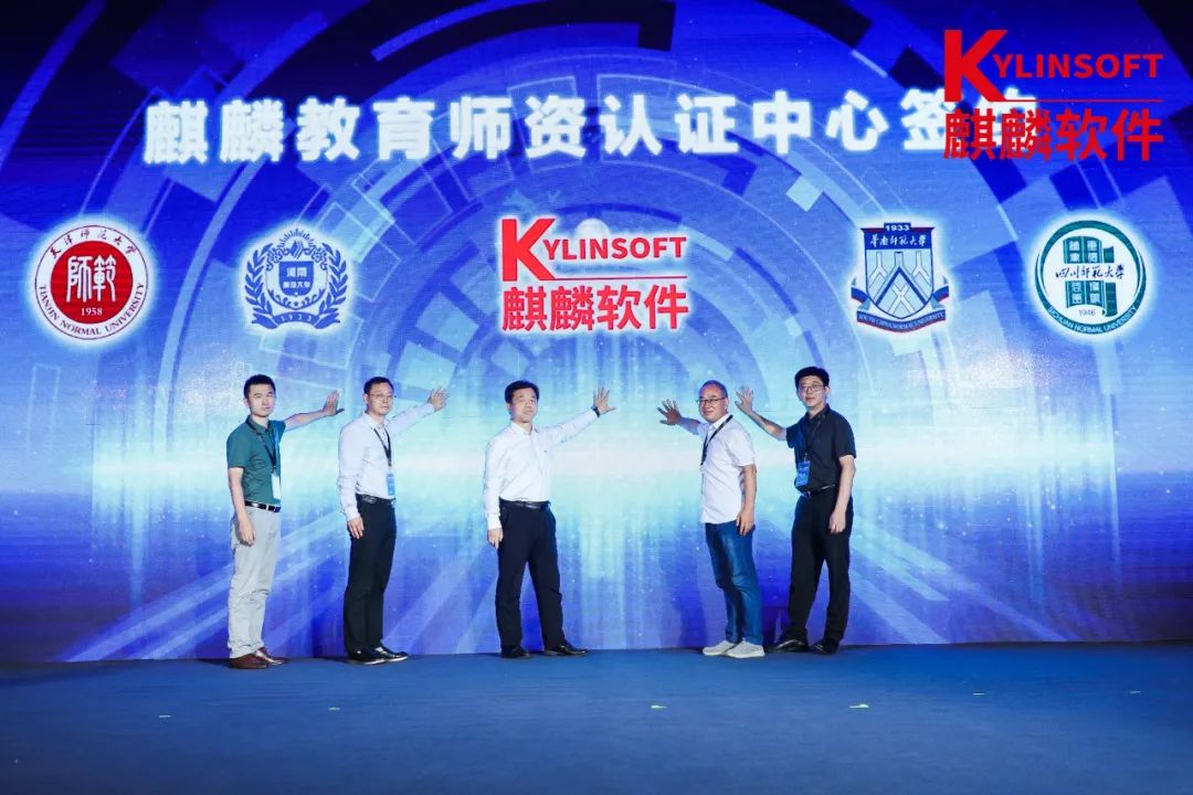 在本次大会上,围绕“产学合作协同育人”“教育师资认证中心“”教育生态合作伙伴“三大板块,麒麟软件与众多高校、教育合作伙伴进行了现场签约仪式,北京航空航天大学教授、麒麟软件高级副总经理兰雨晴(左三)和合作伙伴代表共同点亮签约仪式: