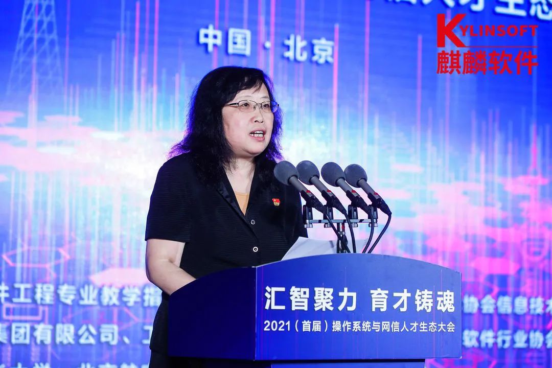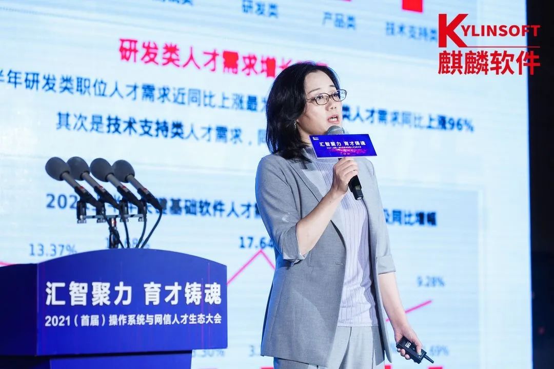 麒麟软件有限公司高级副总裁、麒麟软件教育发展中心主任张娜以“麒麟遨天 育才铸魂——致力于打造中国网信产业发展的人才引擎”为主题带来主旨分享。并发布了麒麟软件联合猎聘大数据研究院发布的《关键基础软件人才数据报告》。该报告显示,近三年关键基础软件领域人才需求急速增长,但市场供给严重不足。2021年上半年研发类职位人才需求同比上涨最为明显,招聘岗位数量同比涨幅超50%,其中研发类人才需求同比上涨96%最为明显(数据来源:猎聘大数据)。