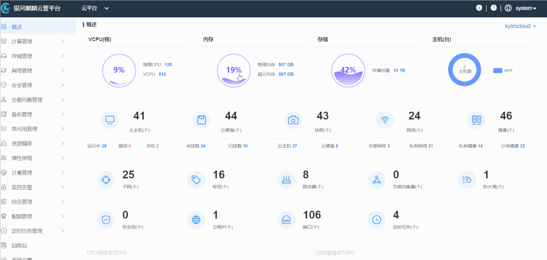 进入云平台概述页面可以看到整个云平台的虚拟内核、内存、存储、网络、云主机等资源的使用情况,以及计算服务、网络服务、存储服务的实时状态,整体界面UI设计新颖灵动,可以快速得知云平台整体概况。