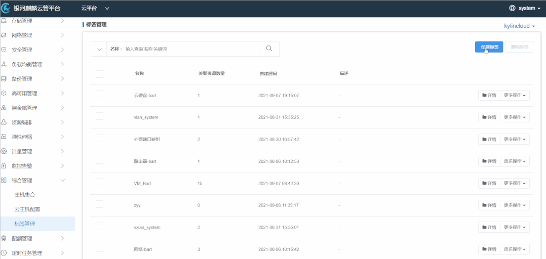 可对云主机、云硬盘等资源进行标签处理,方便用户分类查看资源使用情况。