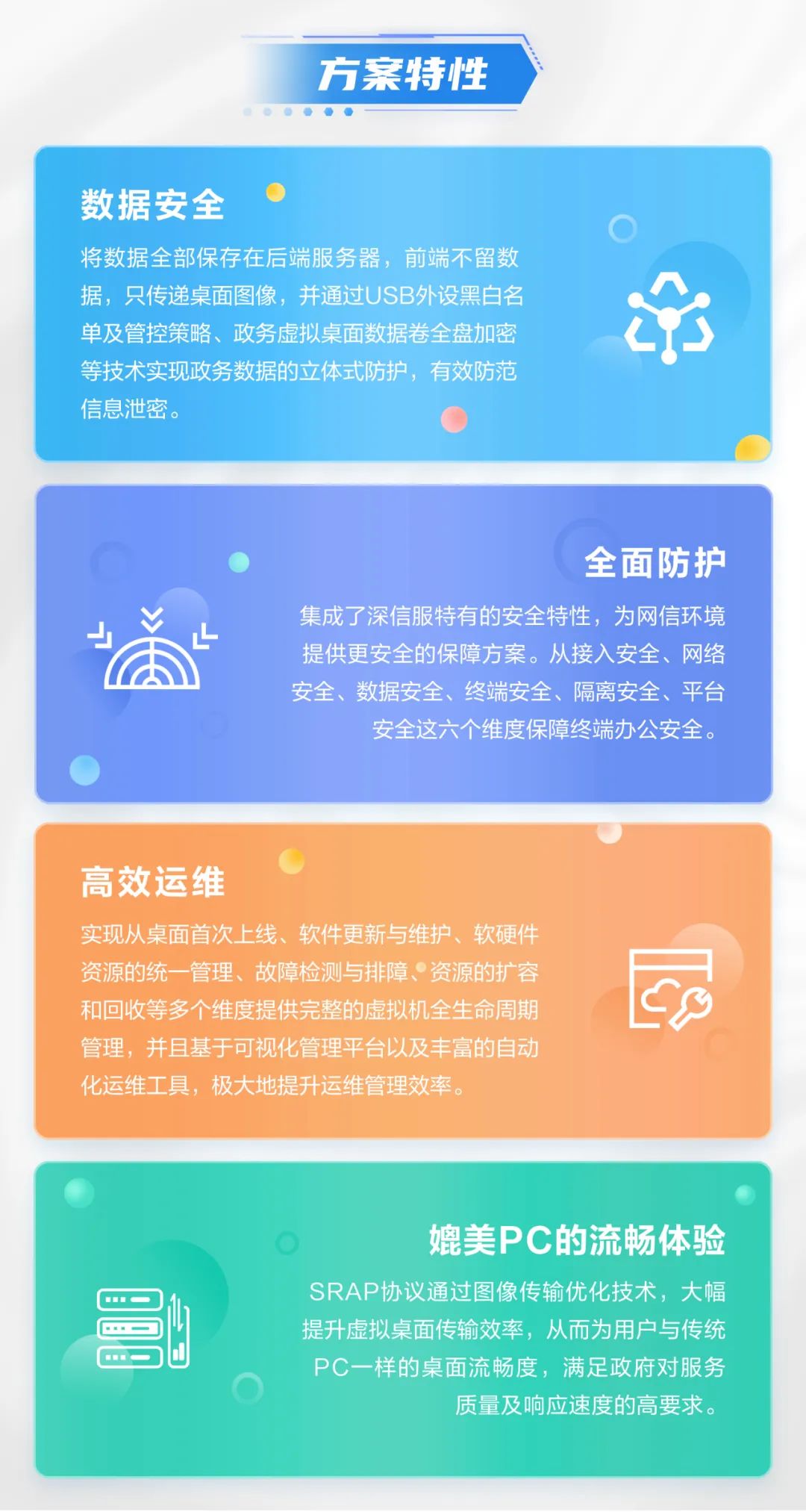 深信服桌面云aDesk与银河麒麟桌面操作系统V10深度适配,在虚拟化技术平台的基础上,充分利用后端服务器计算资源,采用虚拟化、视频优化、组播加速等关键技术,满足了快速交付、高效运维、灵活扩展、稳定运行的目标需求。方案在满足终端办公使用的同时,还为用户带来安全、高效、流畅的桌面使用体验。