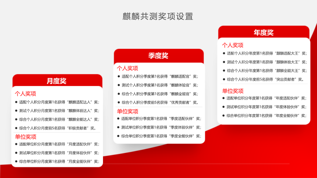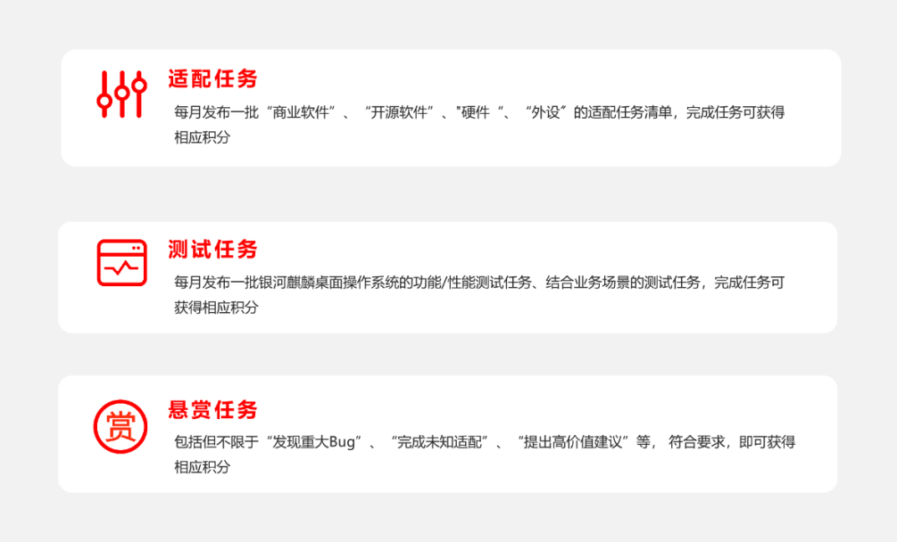 无论你是适配能手还是测试达人,你都是银河麒麟操作系统希望一起携手成长的伙伴,为此,本次活动的奖项设置不仅分个人和单位,分月度、季度和年度,更是贴心准备了适配类和测试类多个奖项。