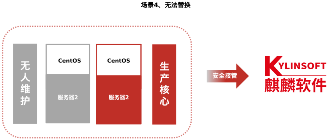 另外,在业务系统无法替换的场景下,麒麟软件还提供CentOS安全接管服务方案,对目前不具备替换条件的核心业务系统或老旧无人维护的业务系统,麒麟软件提供安全接管技术及服务支撑,保障现有CentOS系统安全稳定运行。