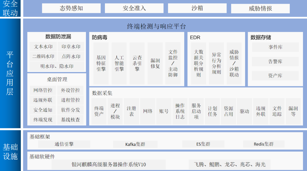 麒麟软件携手迪普科技,依托银河麒麟高级服务器操作系统V10构筑安全、稳定、高效、灵活的基础运行平台,采用迪普终端检测与响应系统软件,打造了适用于不同终端的安全防护和统一管理解决方案。方案集恶意代码防护、桌面管理、数据防泄漏、数据存储、威胁检测、威胁处理响应等能力于一体,有组织有计划地监测和分析终端安全状态,统一配置终端安全策略,提供终端的安全保障能力,确保终端系统正常、高效运行,提供包括事前预警、事中处置、事后溯源的全生命周期终端安全管理,完成安全威胁闭环。