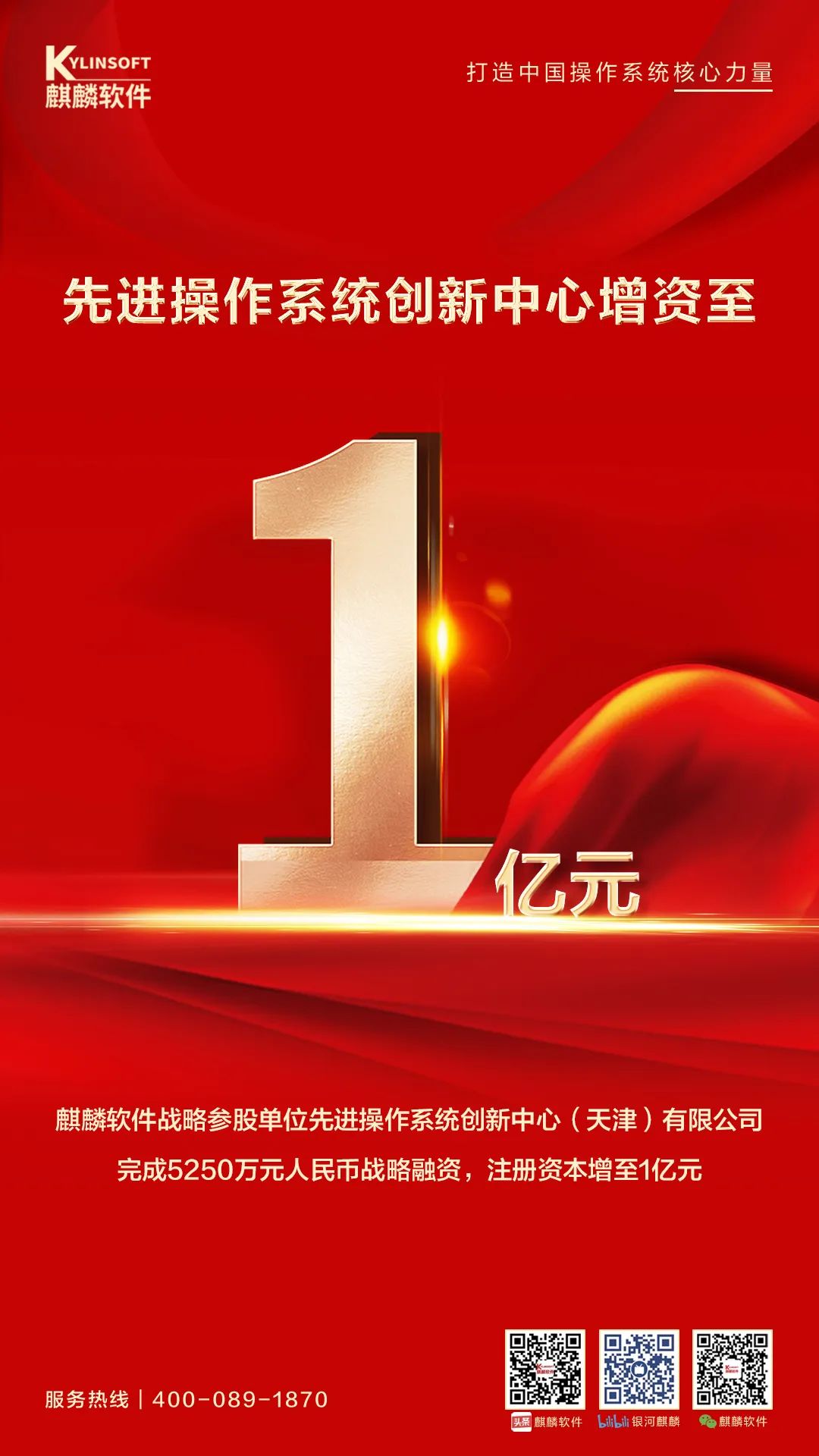 近日,麒麟软件战略参股单位先进操作系统创新中心(天津)有限公司(简称“创新中心”)完成5250万元人民币战略融资,注册资本增至1亿元。本轮融资由麒麟软件、奇安信战略跟投,联合天津海泰海河新动能产业基金合伙企业(有限合伙)、深圳市金蝶天燕云计算股份有限公司、广州中望龙腾软件股份有限公司、电子科技大学广东电子信息工程研究院共同投资。