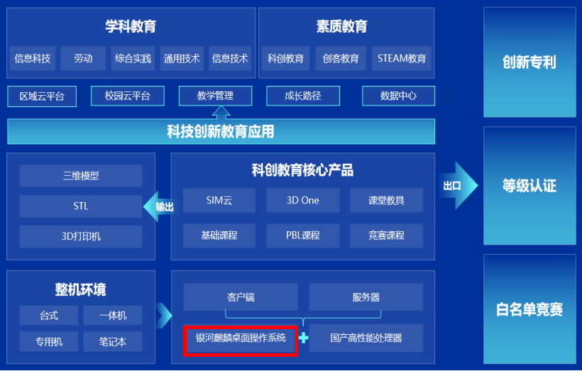 教学环境采用基于银河麒麟桌面操作系统的国产化整机和3D One系列科创软件及课程,为学校课堂教学提供了完整的“教学软件+教学课程+教材教案+师资培训+科创教室”的一体化内容,满足了学校对于开设信息技术相关的科创课程设计及教学的需求。