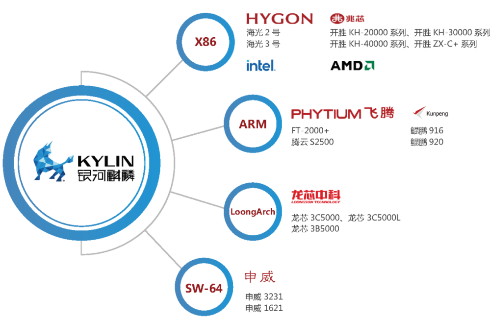 银河麒麟高级服务器操作系统V10 同源支持飞腾、龙芯、鲲鹏、申威、兆芯、海光六大国产平台以及Intel、AMD CPU,兼容国内外主流数据库、中间件等软件产品。操作系统内核由麒麟软件深度研发创新,针对指令级别进行优化,支持vcpu抢占检测、vmalloc内存分配优化、ext4文件系统日志处理优化等,可充分发挥CPU算力,支撑用户业务系统运行更高效,更稳定。