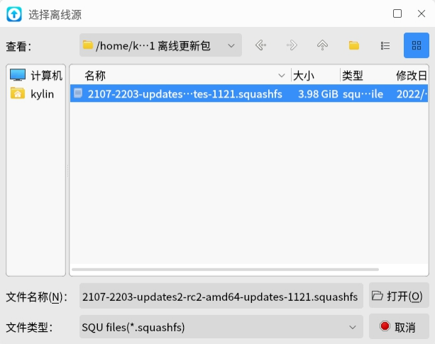 • 在“离线升级管理工具”中点击“选择离线源”,并选中解压包中的.squashfs格式文件,点击“打开”。