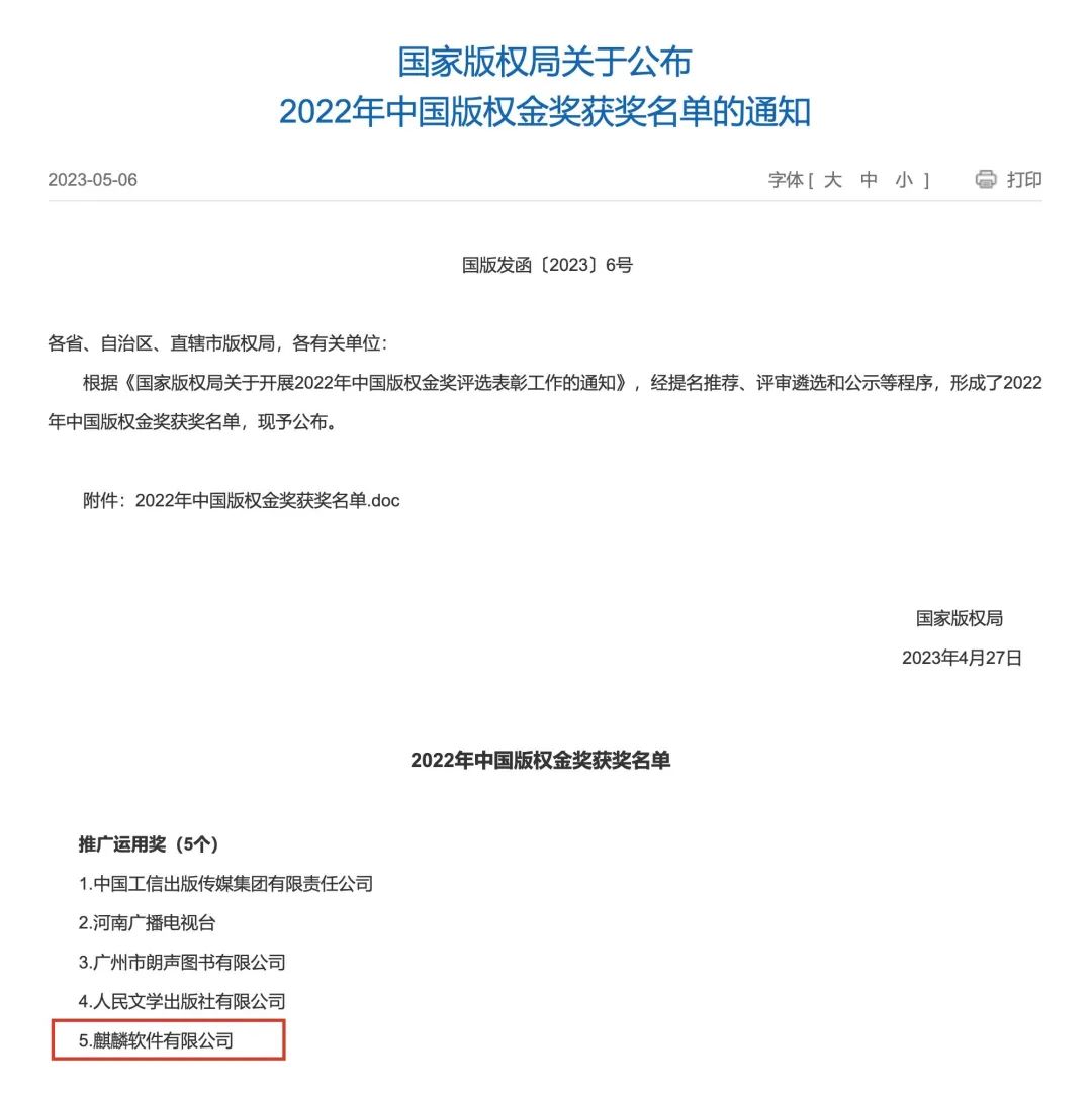 2022年中国版权金奖!麒麟软件荣获中国版权领域最高奖项