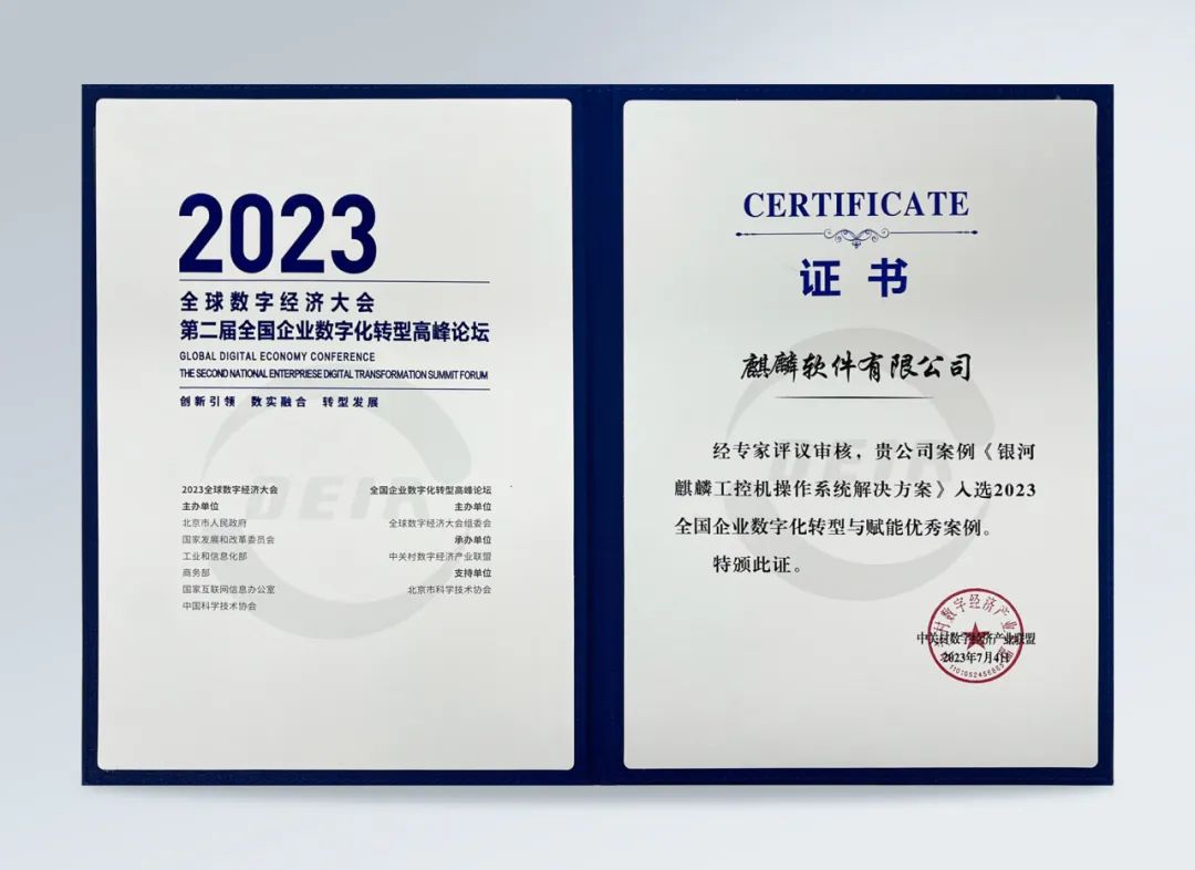 第二届全国企业数字化转型高峰论坛作为2023全球数字经济大会的重要活动之一,同期发布了《2023全国企业数字化转型与赋能优秀案例研究》报告,《银河麒麟工控机操作系统解决方案》成功入选,获评“2023全国企业数字化转型与赋能优秀案例”。