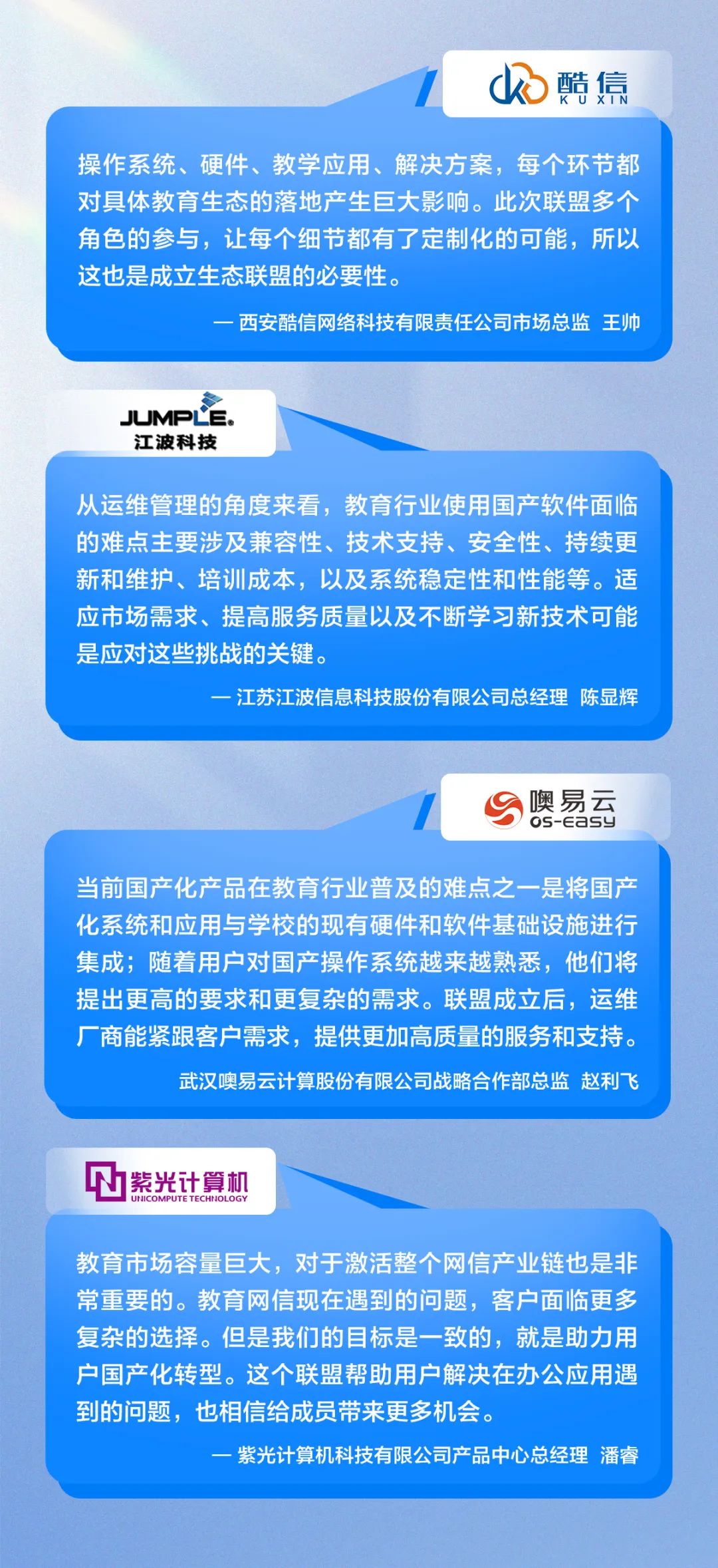 联盟成立后,麒麟软件通过与伙伴深化解决方案合作,推动包括协同办公、电子教室、网信实训平台、信息科技一体化平台、科研算力中心、远程教学、智慧校园、教务管理以及课程开发、产教融合等网信领域的全面发展。