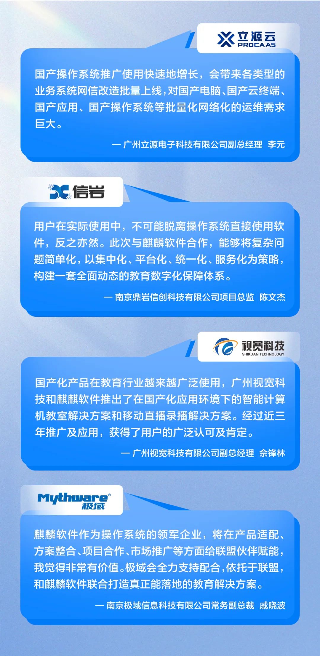 不拒众流,方为江海。麒麟软件坚持开放创新,始终重视与生态伙伴的深度协作,此次教育数字化运管监控联盟的成立正是麒麟软件生态高质量建设的又一重要举措。麒麟软件目前已在金融机具、安全应用、整机厂商等多个领域,通过建设生态联盟、使能成员伙伴,推进国产操作系统生态体系向纵深发展,为行业信息化建设转型升级提供有力支撑。