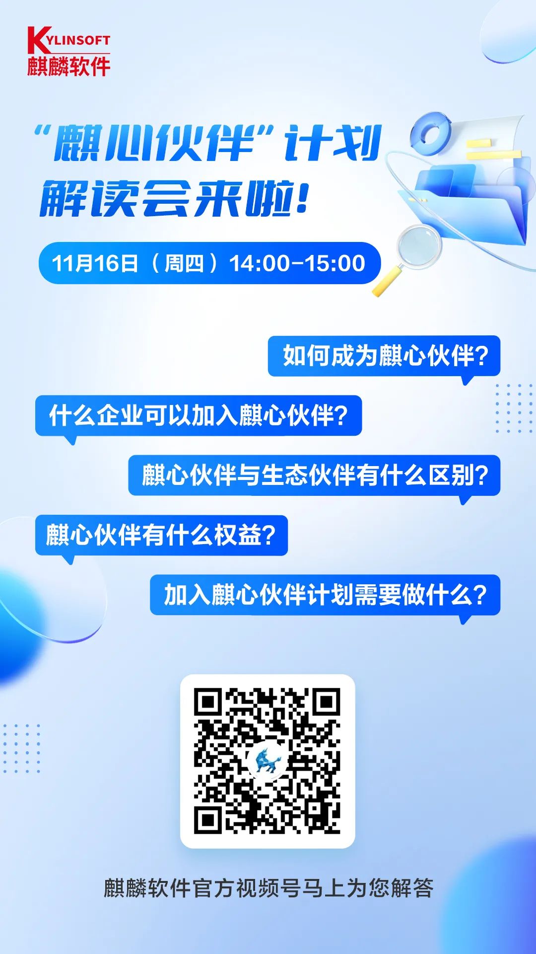 自“麒心伙伴”计划开启以来,受到了来自生态伙伴的广泛关注,为帮助大家全面详尽地了解“麒心伙伴”计划,我们将于11月16日(周四)在线上举办“麒心伙伴”计划解读会,以直播的形式回答伙伴们的咨询和疑问,邀您来到直播间一起畅聊!