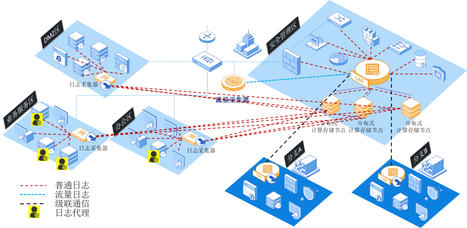 在某省信息中心电子政务外网日志管理项目中,通过可扩展分布式部署(主节点、分布式计算存储节点)对电子政务外网和互联网区2400+设备海量日志进行集中采集、存储和审计,实现不同安全域日志集中管理。方案有效解决了用户不同等级安全域的海量日志数据的集中审计和日志保存180天的问题,满足了《中华人民共和国网络安全法》和等保2.0的合规管理要求,方案可靠的分布式弹性扩展能力也为组织持续发展提供了保障。