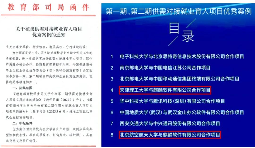 万里挑一!麒麟软件两项校企合作项目入选教育部供需对接就业育人优秀案例