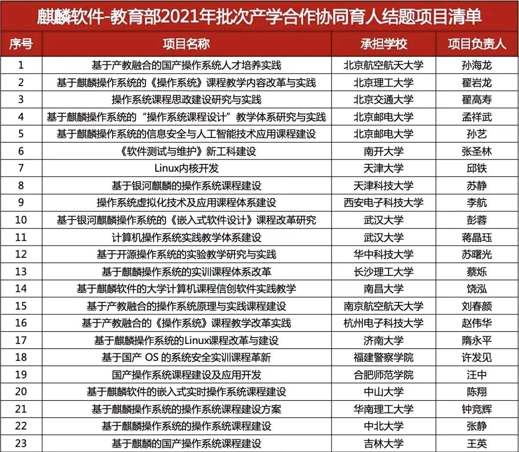 麒麟软件支持参与了中国国际“互联网+”大学生创新创业大赛、全国大学生计算机系统能力大赛操作系统设计赛、金砖国家职业技能大赛信息技术应用创新赛及麒麟杯信创科普挑战赛等十余项国赛、省赛,并斩获了27个一等奖、40个二等奖、34个三等奖等百余个奖项。